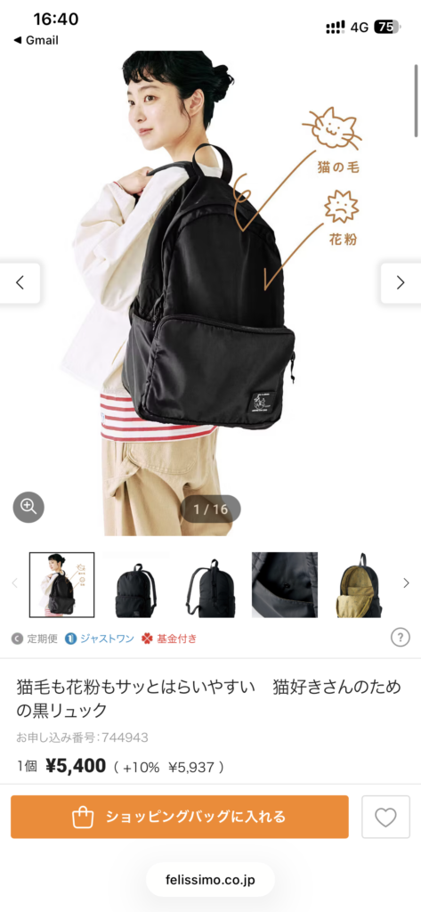 何回か来るパターンの商品もあるが、このように一回だけの商品もある。今回は初回なので一回限りの配送品の中で選んだのだけど、ちょうどリュックが欲しかった上に花粉対策に良さそう&猫が好きなのもありこれにほぼ即決めでした。もうかなり花粉が舞ってるので外行く際はリュックを多用しようと思います。
