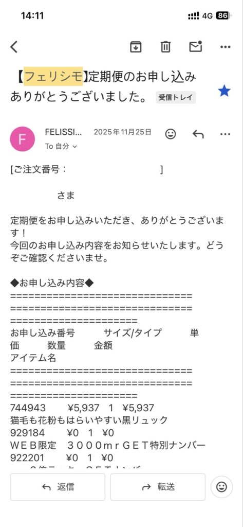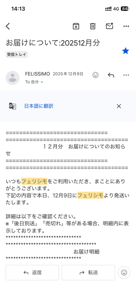 12月9日にフェリシモより発送完了メールを頂く。