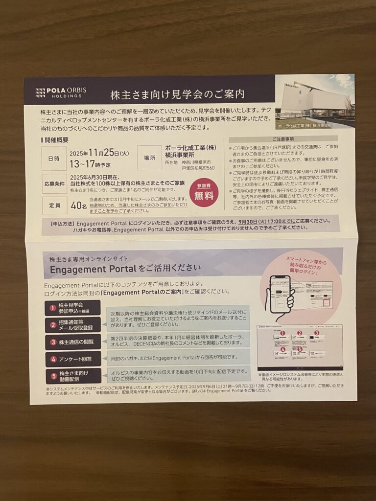 株主優待の変更案内の裏面には事業所見学会の案内が載っていました。