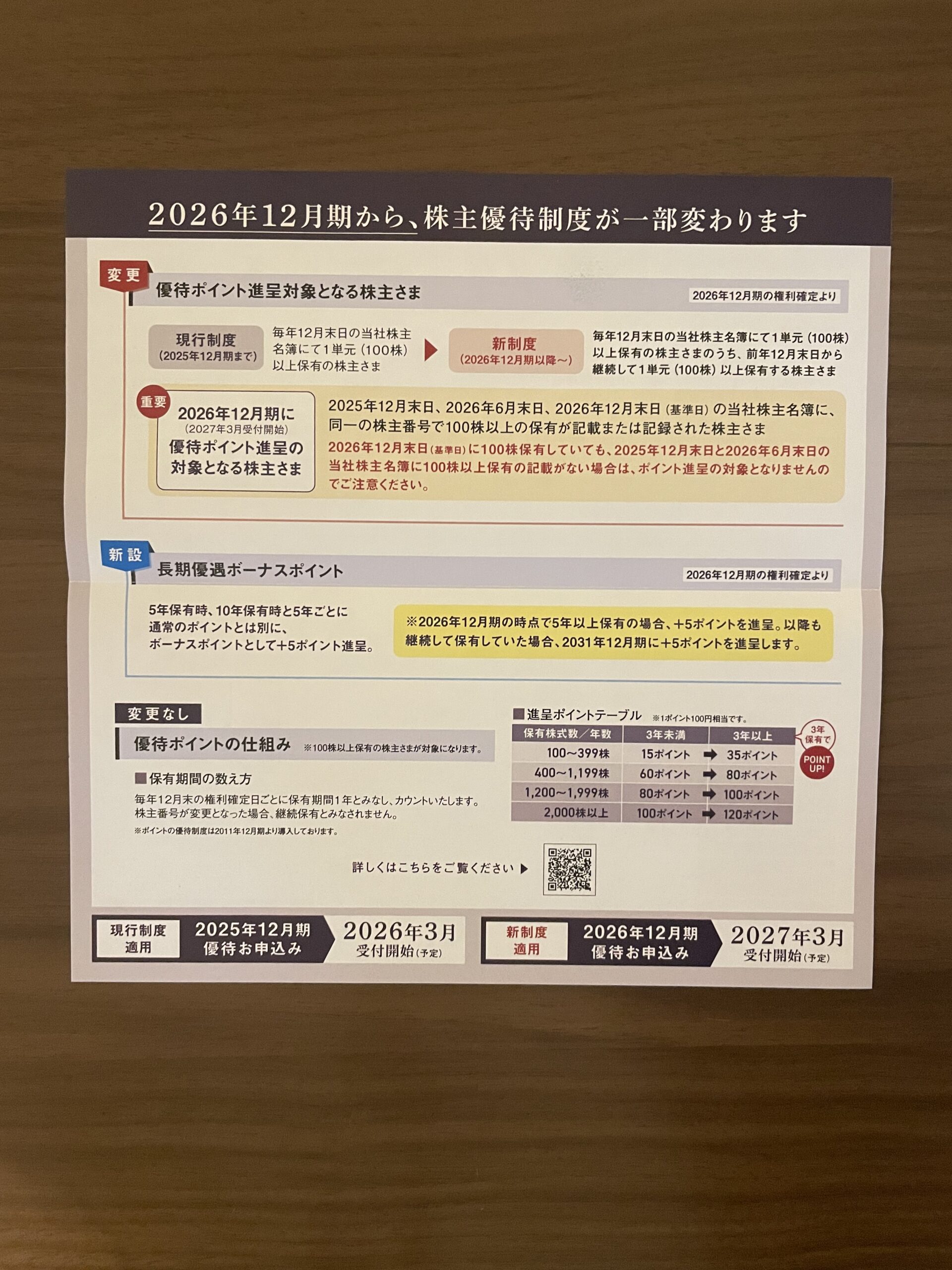 2026年12月期からの株主優待制度が一部変わると言う案内が届いていた。