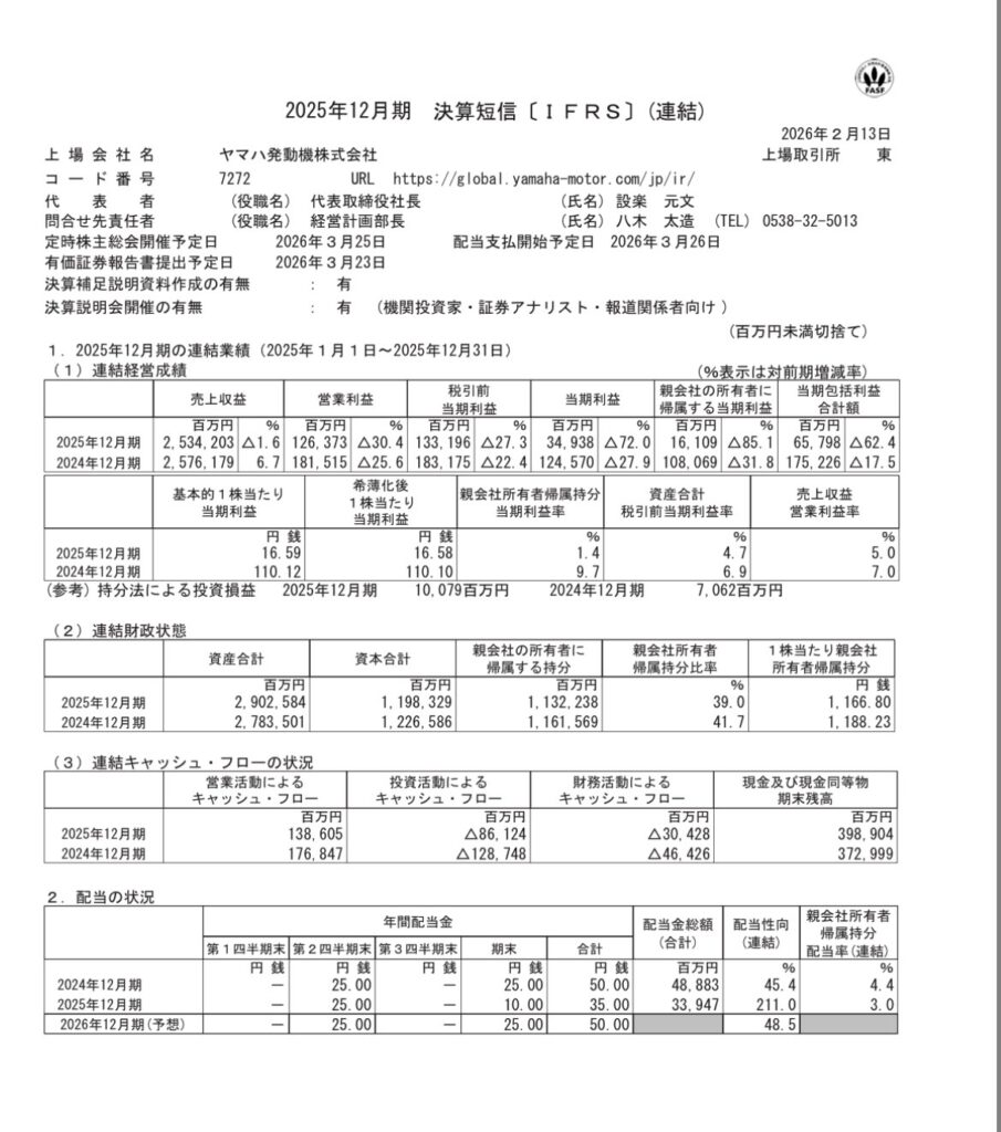 2026年2月2日ヤマハ発動機さんが決算の事前発表された。