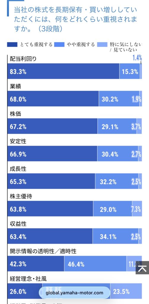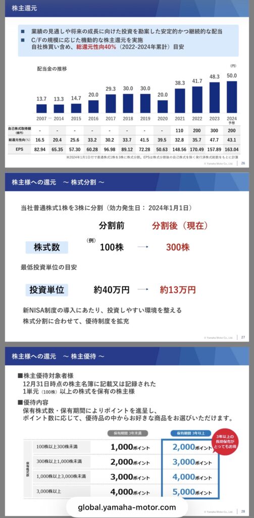 https://global.yamaha-motor.com/jp/ir/event/individual-presentation/2024/pdf/YAMAHA-IR-document_241206.pdfヤマハ発動機株式会社公式HPより。購入する前にHPなどで事前に配当などの情報を確認。個人投資家向けに分かりやすい資料を掲載してくれているのは凄く有り難いと思った。