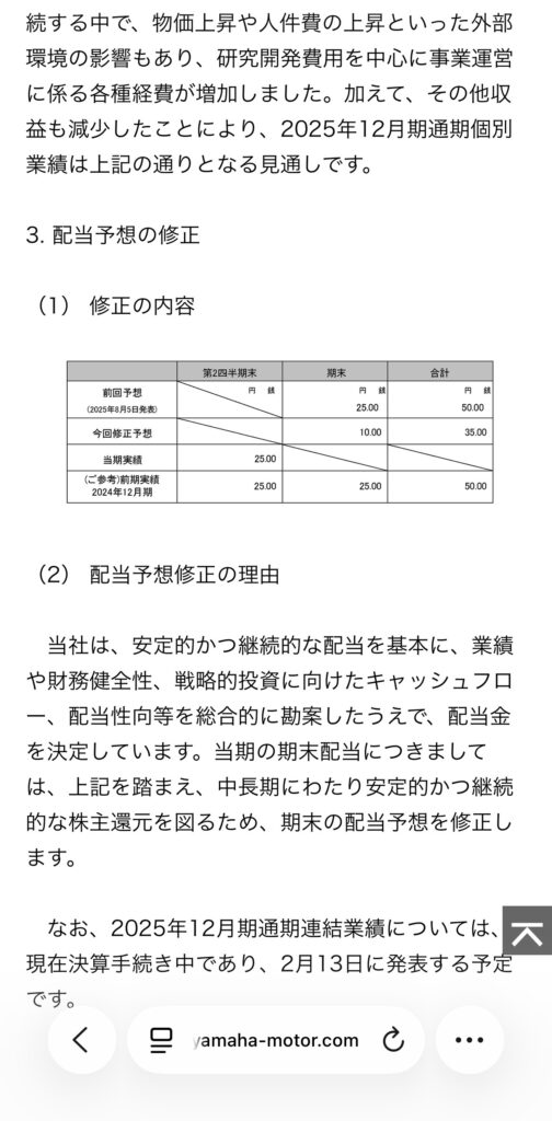 実際どういうことだったんだろうか?と発表された文章を読んでいたら、2025年12月の権利月の期末配当が25円から10円にしますと書かれていた。15円も減配なんて金額の大きさにびっくりした🫢